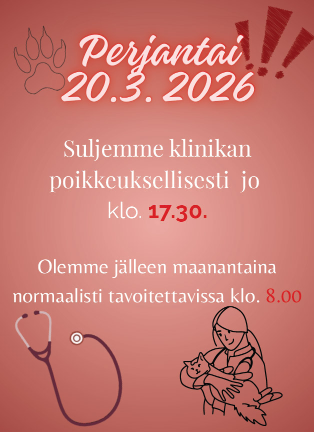 Perjantaina 20.3.2026 suljemme klinikan poikkeuksellisesti jo klo 17:30.